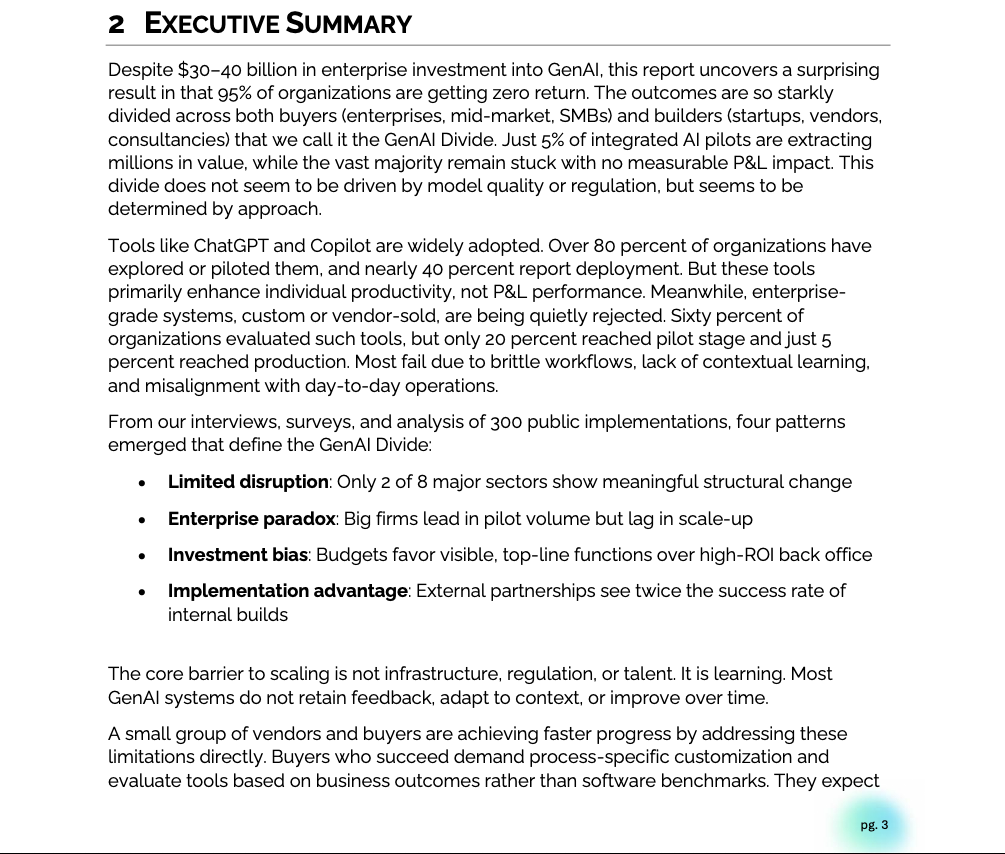 While over 80% of organizations have piloted tools like ChatGPT or Copilot, and nearly 40% have deployed them, these gains remain largely confined to individual productivity. Only 5% of custom GenAI pilots have reached full production, and fewer still have generated measurable profit-and-loss impact.